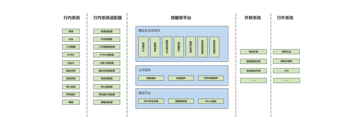 以技术中心、业务元件和场景模型等维度对前置业务进行工厂化重构,技术上采用服务治理平台完成技术组装,管理上采用服务资产管理平台对相关成果 统一的管理。平台由三大部分组成:行内系统适配器(实现行内系统接入微服务平台的适配)、微服务平台(实现业务的流程处理和持久化管理,提供监控及管理功能)、外联平台(实现行内系统与行外系统之间的通讯,屏蔽各个三方系统的通讯差异)。