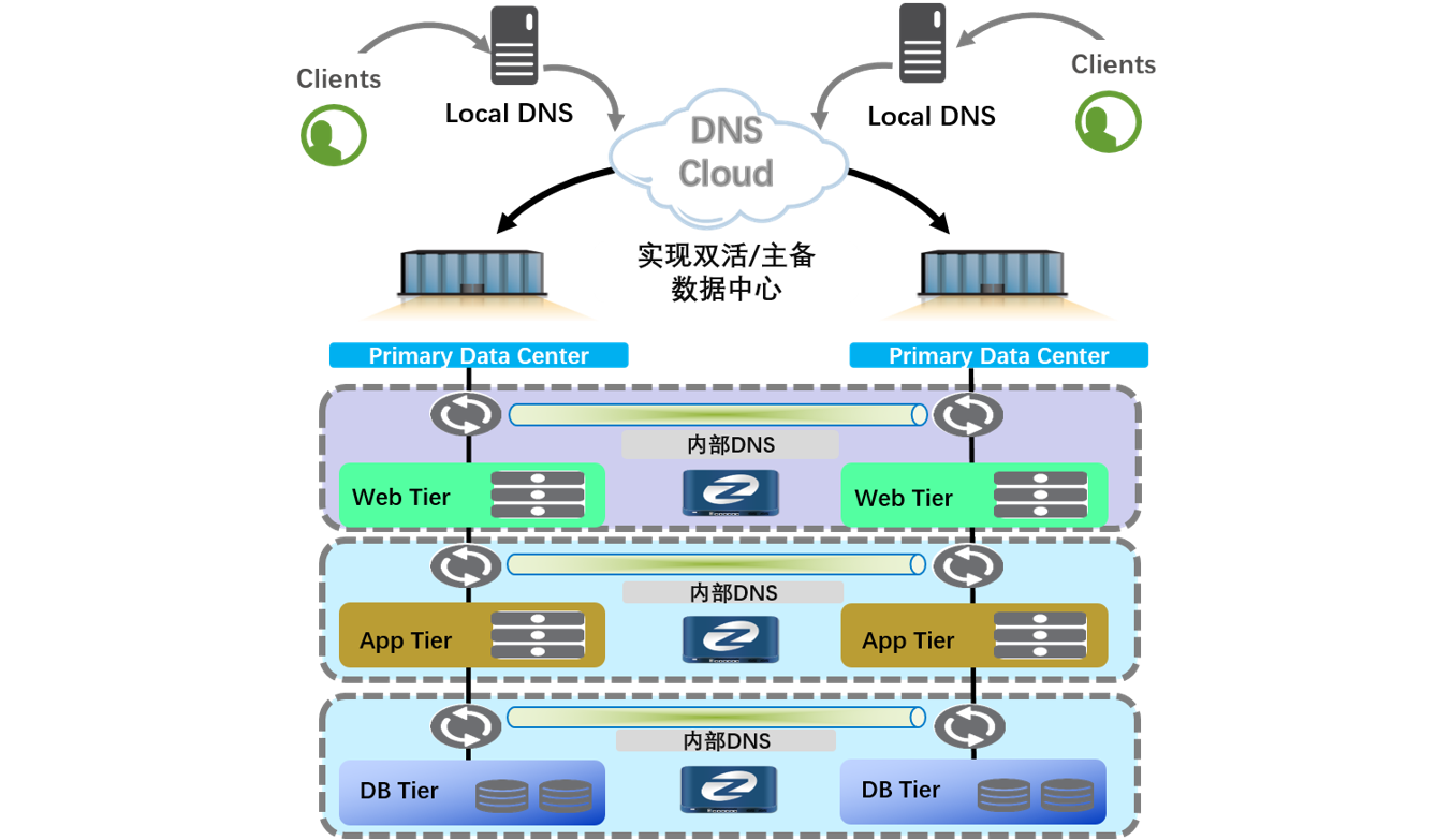 通过内、外部DNS系统的协同,将互联网应用的域名解析引导到数据中心内部的全球负载均衡设备上,达到应用门户智能分流和自动容灾的目的,可以用户地域、用户线路、应用类型等方式分别进行容灾
